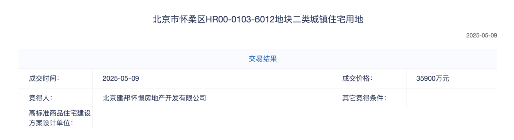 5月9日,北京成功出让一宗怀柔区住宅用地,根据成交结果,北京建工集团旗下北京建邦怀憬房地产开发有限公司以底价3.59亿元摘得地块,成交楼面价16531元/平方米。